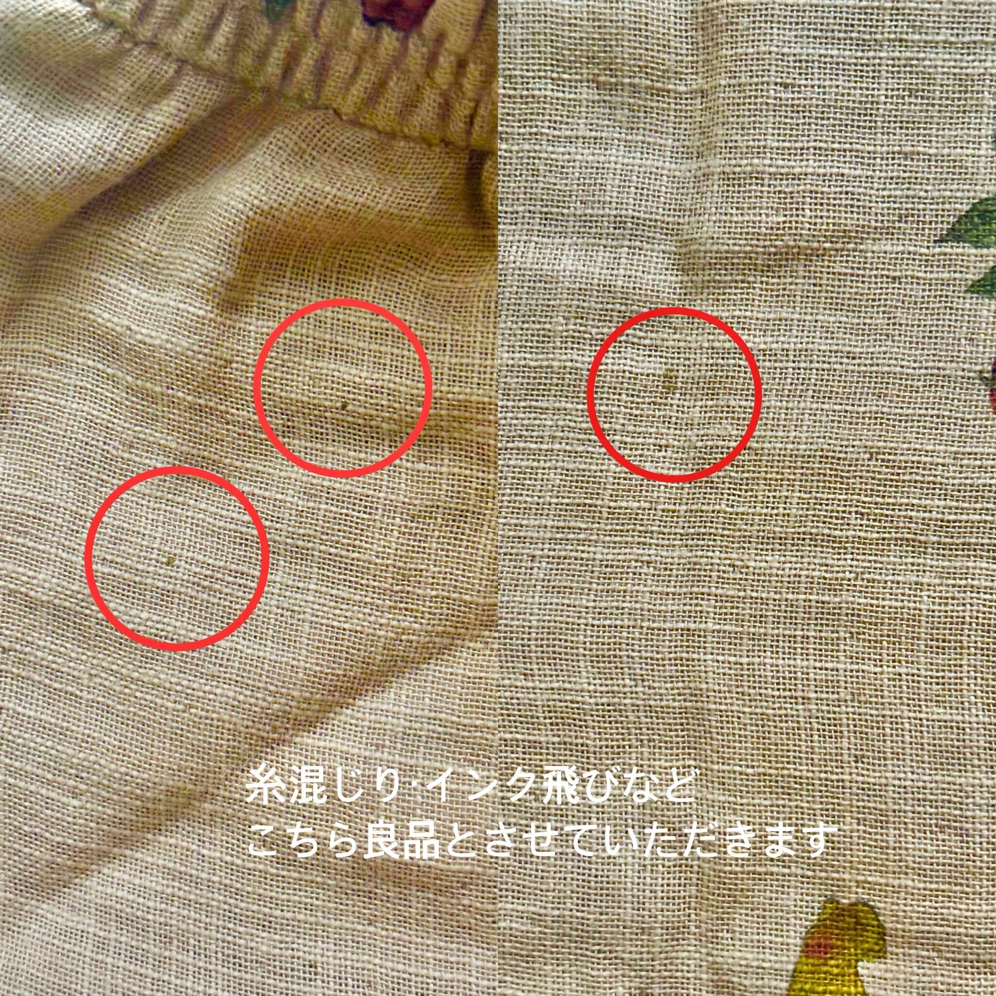 オーガニックコットン特有の他糸混入などを含む黒い点、汚れ、インク飛び、柄の擦れ、などが多く見られますが、こちらは良品とさせていただきます。